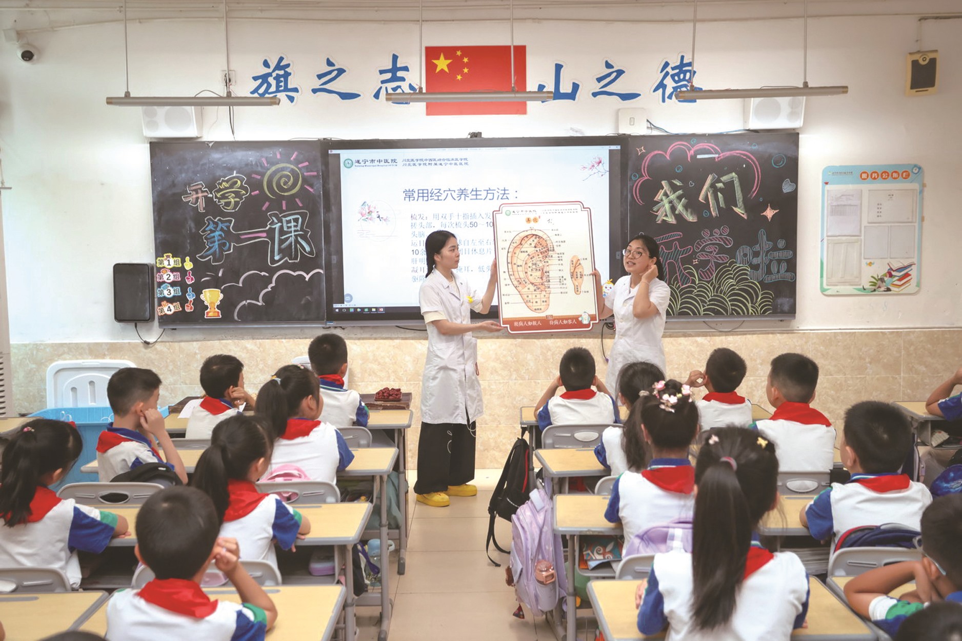 近日,四川省遂宁市中医院的医生走进遂宁市河东实验小学,为学生们带来别开生面的“开学第一课”。这场以“中医药文化进校园”为主题的健康宣教活动,医生们通过讲解耳朵穴位等经穴养生方法让学生们了解人体健康的基本原理,还通过触摸、闻香、观察等方式让学生认识中药材的特性与功能,感受中医“望闻问切”的独特魅力。